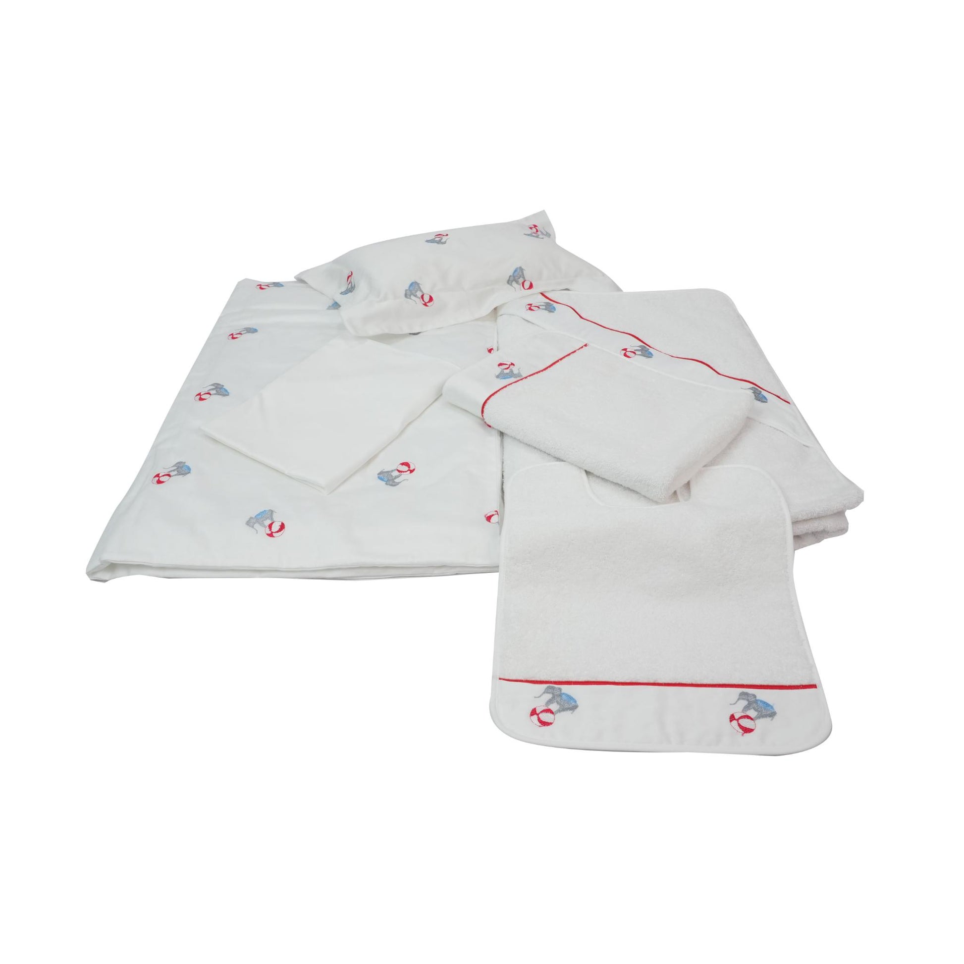 100% COTTON, 300TC, THIS BABY SET INCLUDES DUVET COVER 60CM X 80CM, TOWEL 40CM X 60CM, TOWEL 100CM X 100CM, AND A BABY BIB, AND PILLOW ELEPHANT DESIGN, MADE IN ITALY